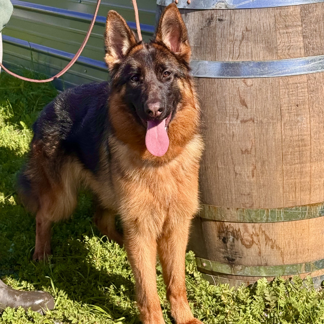 Indi is a stunning black and red female, freshly arrived from Germany and ready to find her perfect home. She boasts a beautiful, rich show coat and the classic elegance expected of a top-quality West German Shepherd.